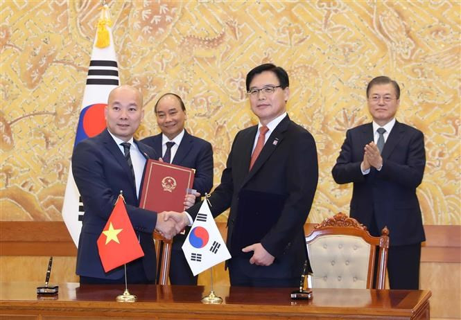 El presidente de Corea del Sur, Moon Jae-in,y el primer ministro, Nguyen Xuan Phuc, presencian la firma de varios acuerdos (Foto: VNA)