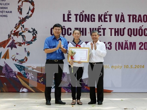 La estudiante Pham Phuong Thao recibe premio en la edición 43 del Concurso juvenil internacional de composiciones epistolares 2014 de la Unión Postal Universal, Fuente: VNA